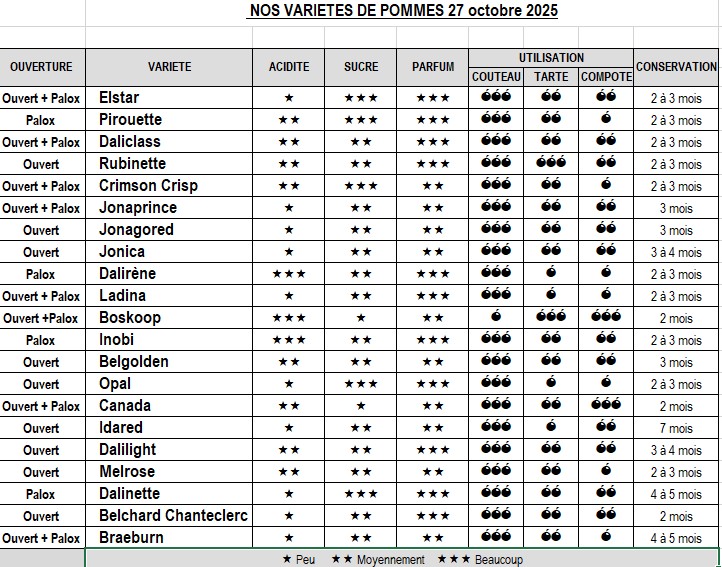 Retrouvez dans le tableau ci-dessous les variétés de pommes disponibles dans le verger et sous la grange.